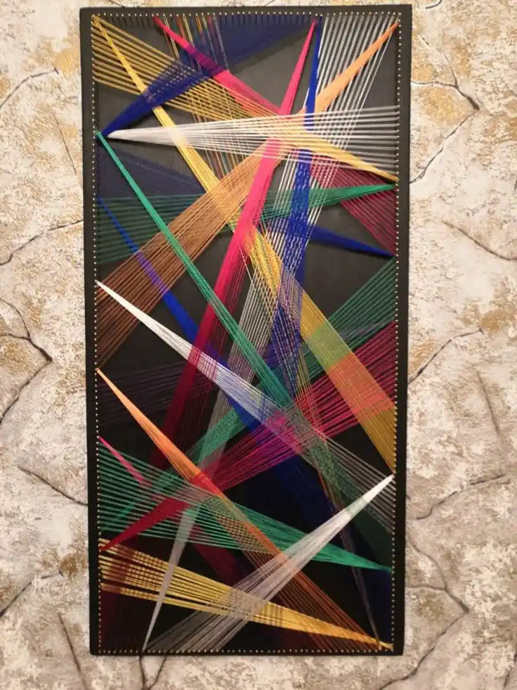 Vibrant Abstract Design: This striking string art piece features a dynamic, abstract design of multi-colored threads crisscrossing a dark background. The vibrant hues of red, yellow, green, blue, and white create a burst of color that is both energetic and visually appealing.