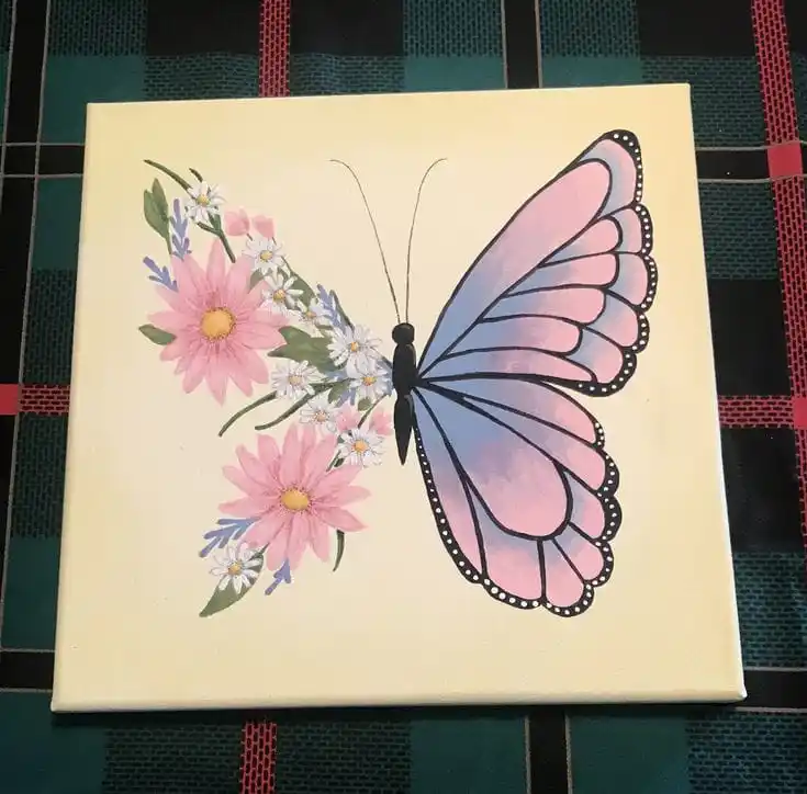 A beautiful hand-painted canvas featuring a whimsical butterfly with a floral wing design in a soft, pastel color palette.