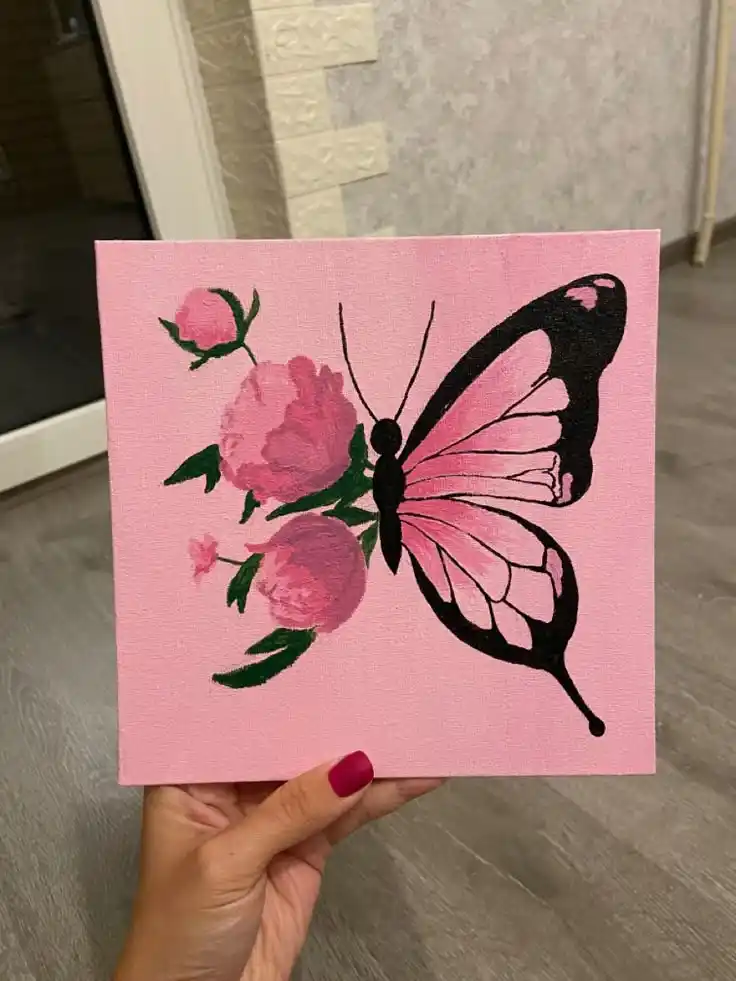 Charming and Feminine Design: The painting uses a soft pink background and a matching pink butterfly and flowers, creating a delicate, charming, and feminine piece of art.