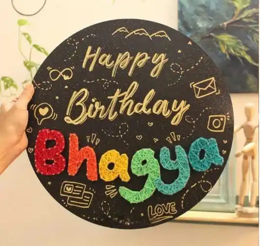 This unique, handmade string art sign is the perfect personalized gift to celebrate a birthday. The circular sign features the words “Happy Birthday” in elegant script, with the name “Bhagya” created in colorful string art. The black background is adorned with charming doodle-like accents.