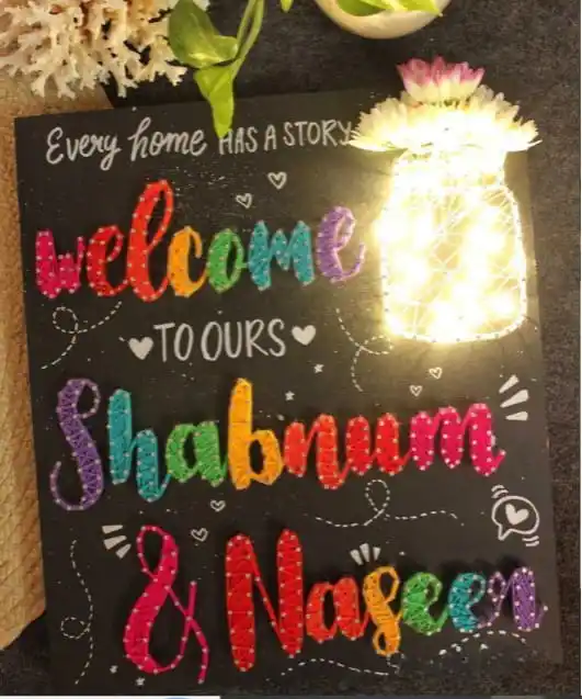 This beautifully crafted, handmade string art sign is a personalized and inviting piece of home decor. The black background features the phrase “Every home has a story. Welcome to ours,” with the names “Shabnum & Naseem” created in vibrant, colorful string art. A charming, lit jar adds a touch of warmth and magic.