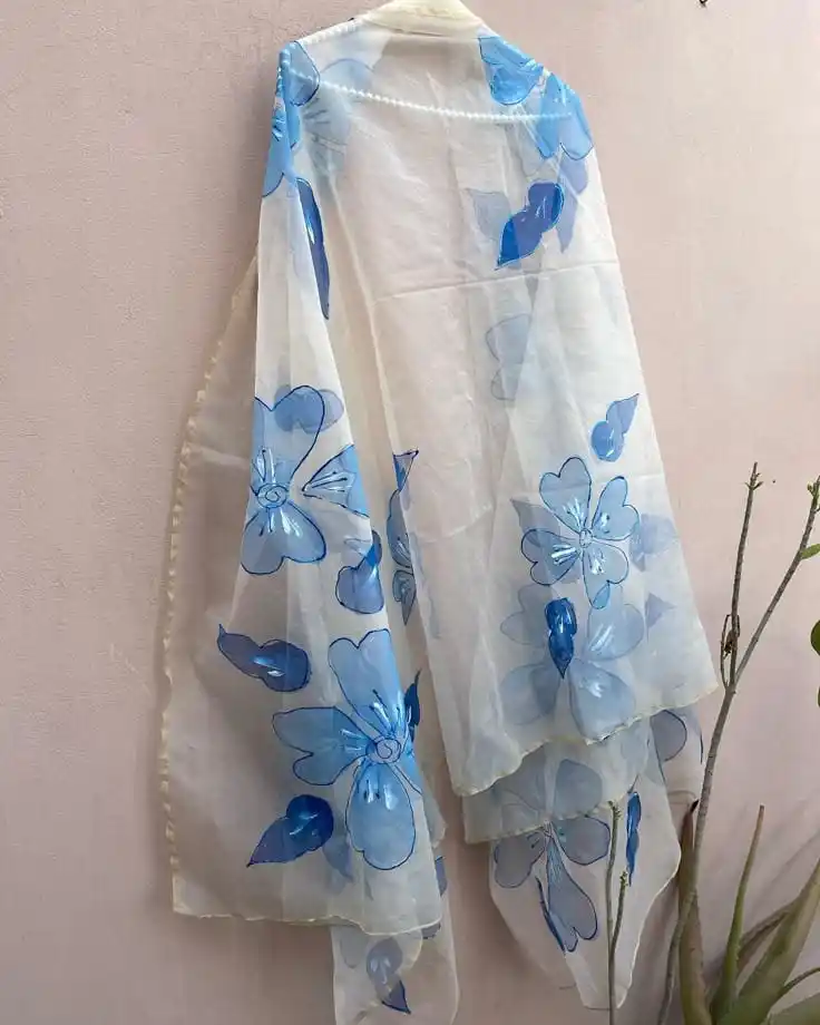 Authentic Hand-Painted Art: This scarf is a one-of-a-kind, hand-painted piece featuring beautiful and artistic blue flowers on a sheer white background.