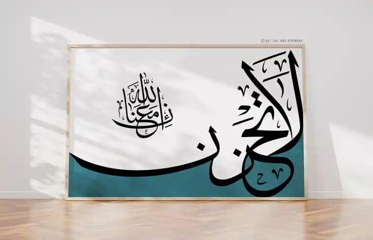 This elegant, handmade canvas features the powerful and reassuring Quranic verse “La Tahzan Innallaha Ma’ana,” which translates to “Do not grieve; indeed, Allah is with us.” The bold black calligraphy is set against a clean white and deep teal background, creating a serene and modern design.