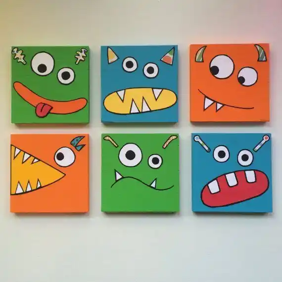 A set of six hand-painted canvases featuring playful and whimsical monster faces, perfect for adding a fun and colorful touch to a child’s room or any creative space.