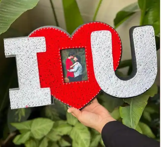 This unique, handmade string art piece doubles as a personalized photo frame, spelling out “I ❤️ U.” The red string art heart frames a cherished photo, while the “I” and “U” are crafted with intricate white string art. This is a perfect gift for a loved one.