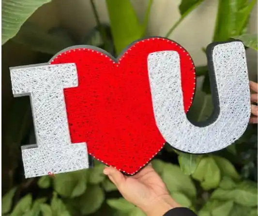This striking, handmade string art piece spells out “I ❤️ U,” making it a perfect declaration of love and affection. The vibrant red string art heart is flanked by intricate white string art letters, creating a bold and romantic statement.