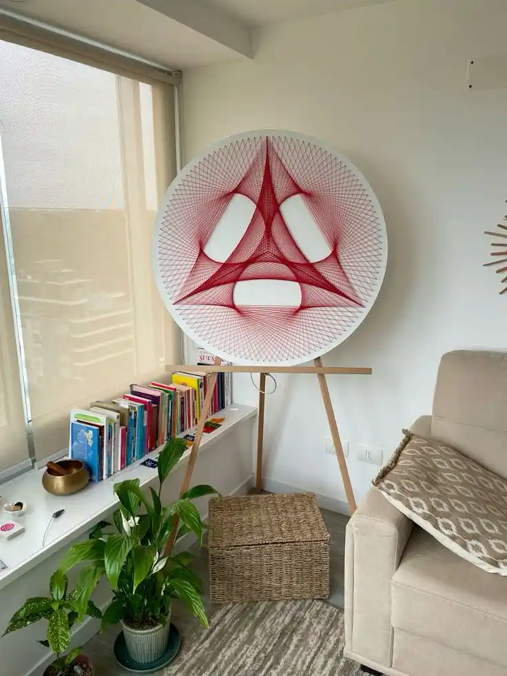 Striking Geometric Design: This large 24×24 inch circular string art piece features a mesmerizing abstract design. The intricate pattern of red threads creates a series of interlocking triangles and shapes, giving the artwork a sense of depth and complexity.