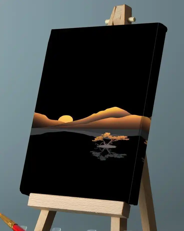 Make a bold and elegant statement with this stunning minimalist landscape painting. This unique artwork features a serene, high-contrast scene with a glowing sun setting behind abstract mountains. The foreground is anchored by the delicate silhouette of a single tree, with its reflection visible in the calm water.