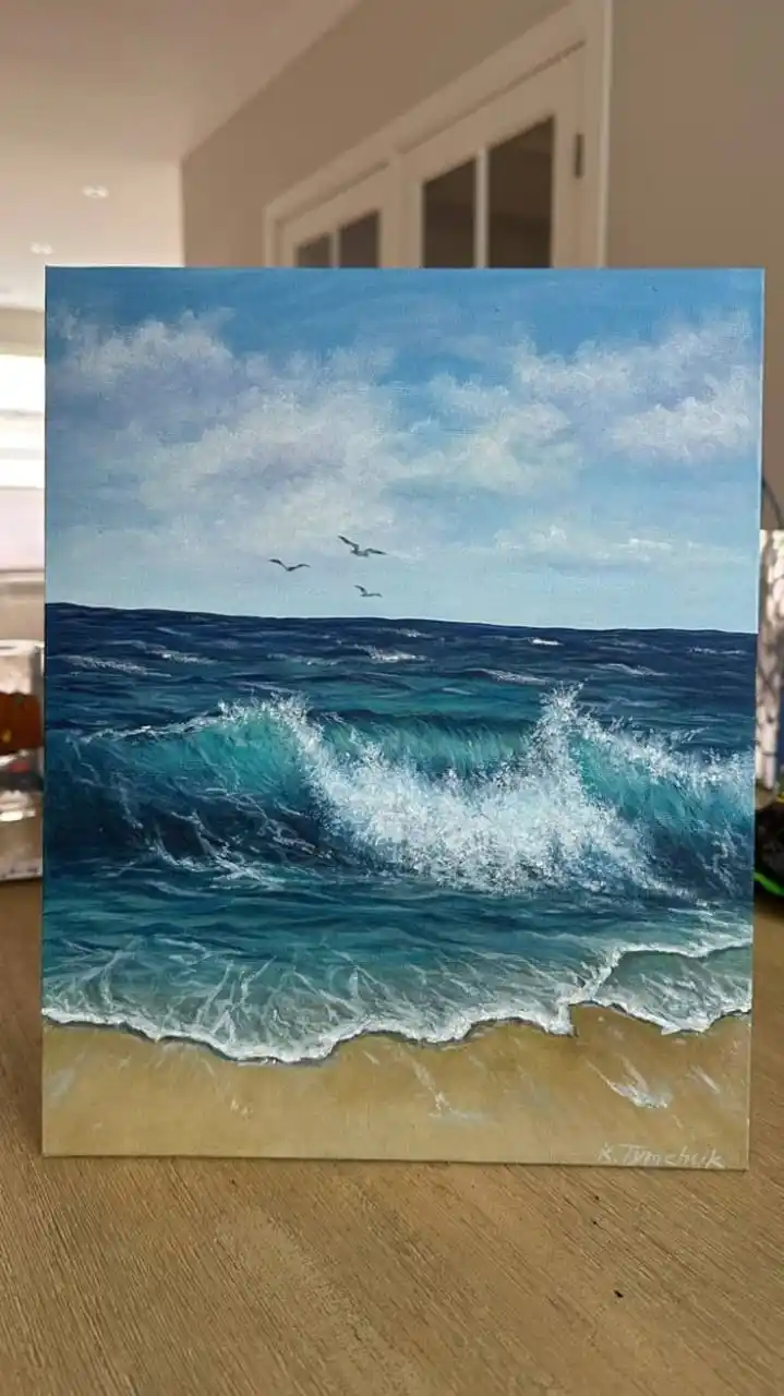 Capture the serene beauty of the coast with this stunning original ocean wave painting. Hand-painted with meticulous detail, this vibrant artwork brings a piece of the sea into your home. The dynamic scene features a crashing turquoise wave against a tranquil sandy shore, with seagulls gliding peacefully overhead