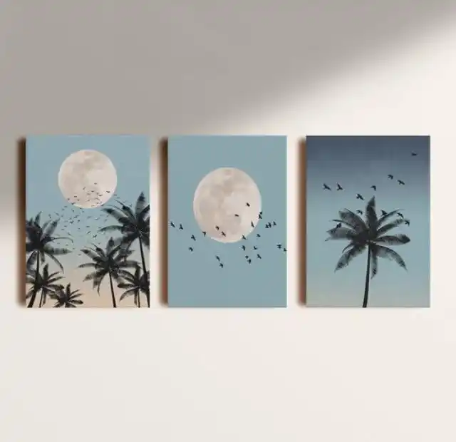 Tranquil Tropical Scene: This set of three canvas prints captures serene tropical evenings with detailed silhouettes of palm trees against a backdrop of a luminous full moon and a soft, gradient sky, creating a peaceful and relaxing ambiance.