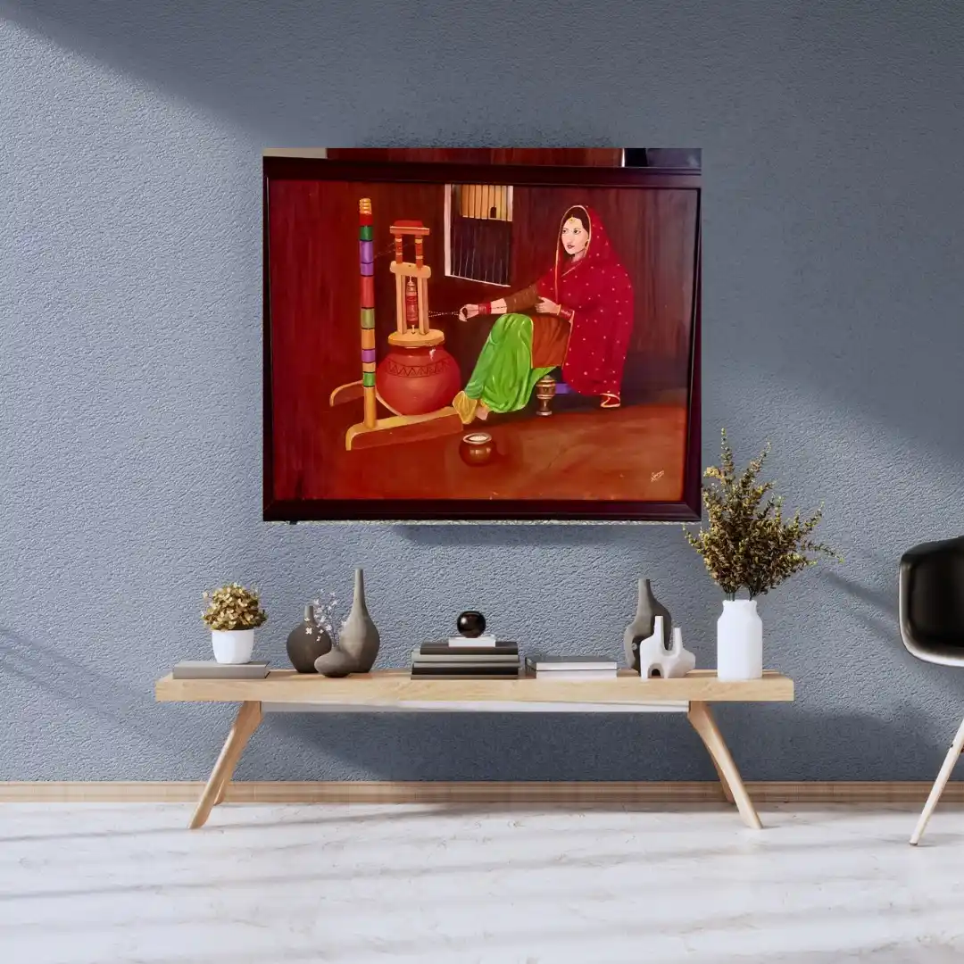 This vibrant, handmade painting depicts a traditional scene of a woman churning butter, a timeless image from South Asian folk culture. The rich colors and cultural theme make this a powerful and meaningful piece of art.